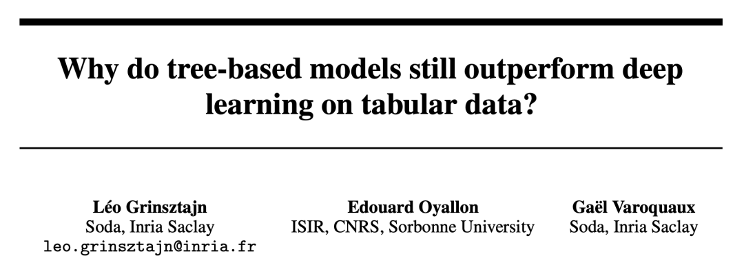 深度学习在图像、语言甚至音频等领域取得了巨大的进步。然而,在处理表格数据上,深度学习却表现一般。由于表格数据具有特征不均匀、样本量小、极值较大等特点,因此很难找到相应的不变量。基于树的模型不可微,不能与深度学习模块联合训练,因此创建特定于表格的深度学习架构是一个非常活跃的研究领域。许多研究都声称可以击败或媲美基于树的模型,但他们的研究遭到很多质疑。事实上,对表格数据的学习缺乏既定基准,这样一来研究人员在评估他们的方法时就有很多自由度。此外,与其他机器学习子域中的基准相比,大多数在线可用的表格数据集都很小,这使得评估更加困难。为了缓解这些担忧,来自法国国家信息与自动化研究所、索邦大学等机构的研究者提出了一个表格数据基准,其能够评估最新的深度学习模型,并表明基于树的模型在中型表格数据集上仍然是 SOTA。对于这一结论,文中给出了确凿的证据,在表格数据上,使用基于树的方法比深度学习(甚至是现代架构)更容易实现良好的预测,研究者并探明了其中的原因。论文地址:https://hal.archives-ouvertes.fr/hal-03723551/document值得一提的是,论文作者之一是 Gaël Varoquaux ,他是 Scikit-learn 计划的领导者之一。目前该项目在 GitHub 上已成为最流行的机器学习库之一。而由 Gaël Varoquaux 参与的文章《Scikit-learn: Machine learning in Python》,引用量达 58949。该研究为表格数据创建了一个新的基准(选取了 45 个开放数据集),并通过 OpenML 共享这些数据集,这使得它们易于使用。该研究在表格数据的多种设置下比较了深度学习模型和基于树的模型,并考虑了选择超参数的成本。该研究还分享了随机搜索的原始结果,这将使研究人员能够廉价地测试新算法以获得固定的超参数优化预算。