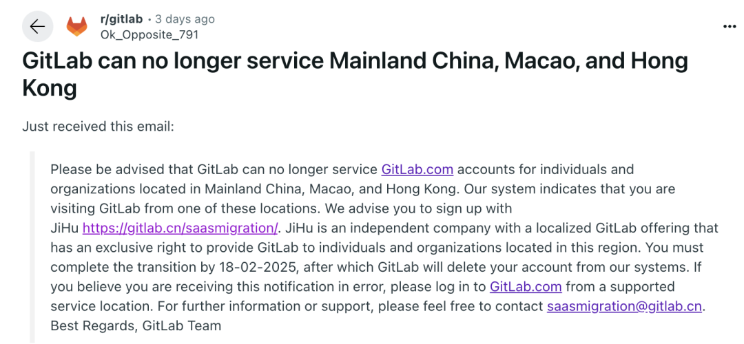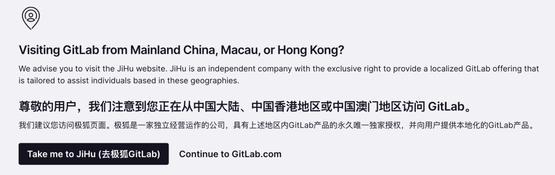 请注意,GitLab 不再为位于中国大陆、澳门和香港的个人和组织提供 GitLab.com 帐户服务。我们的系统显示您正在从这些位置之一访问 GitLab。我们建议您注册极狐 JiHu https://gitlab.cn/saasmigration/ 。JiHu 是一家独立公司,提供本地化的 GitLab 产品,并拥有向该地区的个人和组织提供 GitLab 的独家权利。您必须在 2025 年 2 月 18 日之前完成迁移,之后 GitLab 将从我们的系统中删除您的帐户。如果您认为收到此通知有误,请从受支持的服务位置登录 GitLab.com。如需更多信息或支持,请随时联系 saasmigration@gitlab.cn。