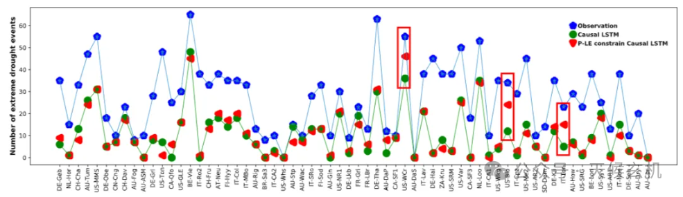 图8 CLSTM(绿色圆圈)和物理约束的CLSTM(红色三角形)相对于观测值(蓝色五角星)在极端干旱事件预测方面的能力。干旱事件通过SWDI进行评估。用红色矩形注释了三个在物理约束的CLSTM中显著改进的站点