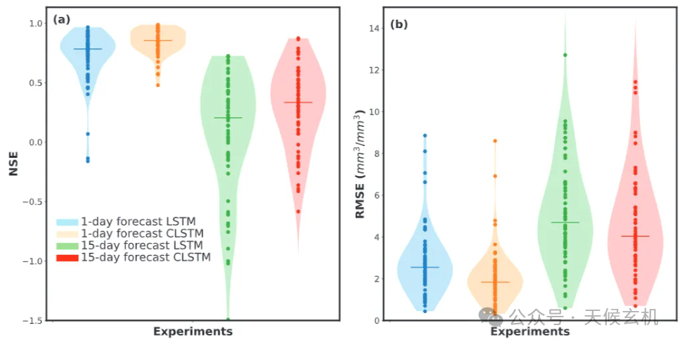 不同时间尺度的应用:CLSTM 在 1 天和 15 天的预测中,NSE 更大,RMSE 更小,统计指标改善,7 天和 15 天预测改进幅度大于 1 天预测,随着时间尺度增加,DL 模型易过拟合,但 CLSTM 泛化能力显著提升,表明其有改进长期土壤湿度预测的潜力。