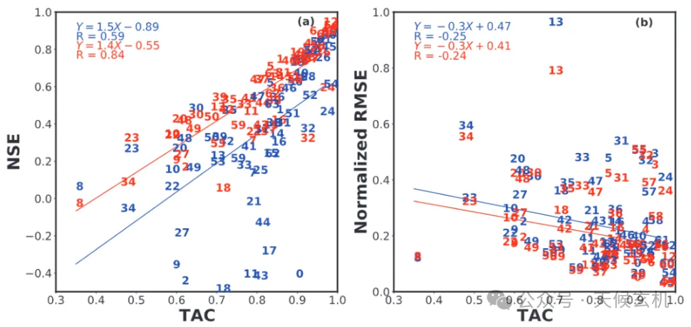 纯 DL 模型和因果结构 DL 模型的总体性能:CLSTM 在测试期间的预测性能优于 LSTM,NSE 中位数从 0.34 提升到 0.52,RMSE 中位数从 3.98% 降至 3.47%,在不同统计指标上表现更好,稳定性更高,在全球多数站点(尤其是欧洲和美国中东部)表现出色,但在澳大利亚、加拿大等地表现较差,原因与土壤湿度时间自相关(TAC)和训练数据量有关,在不同土壤记忆条件下,CLSTM 能显著提升 NSE 和归一化 RMSE(NRMSE),尤其在 TAC 较低区域。