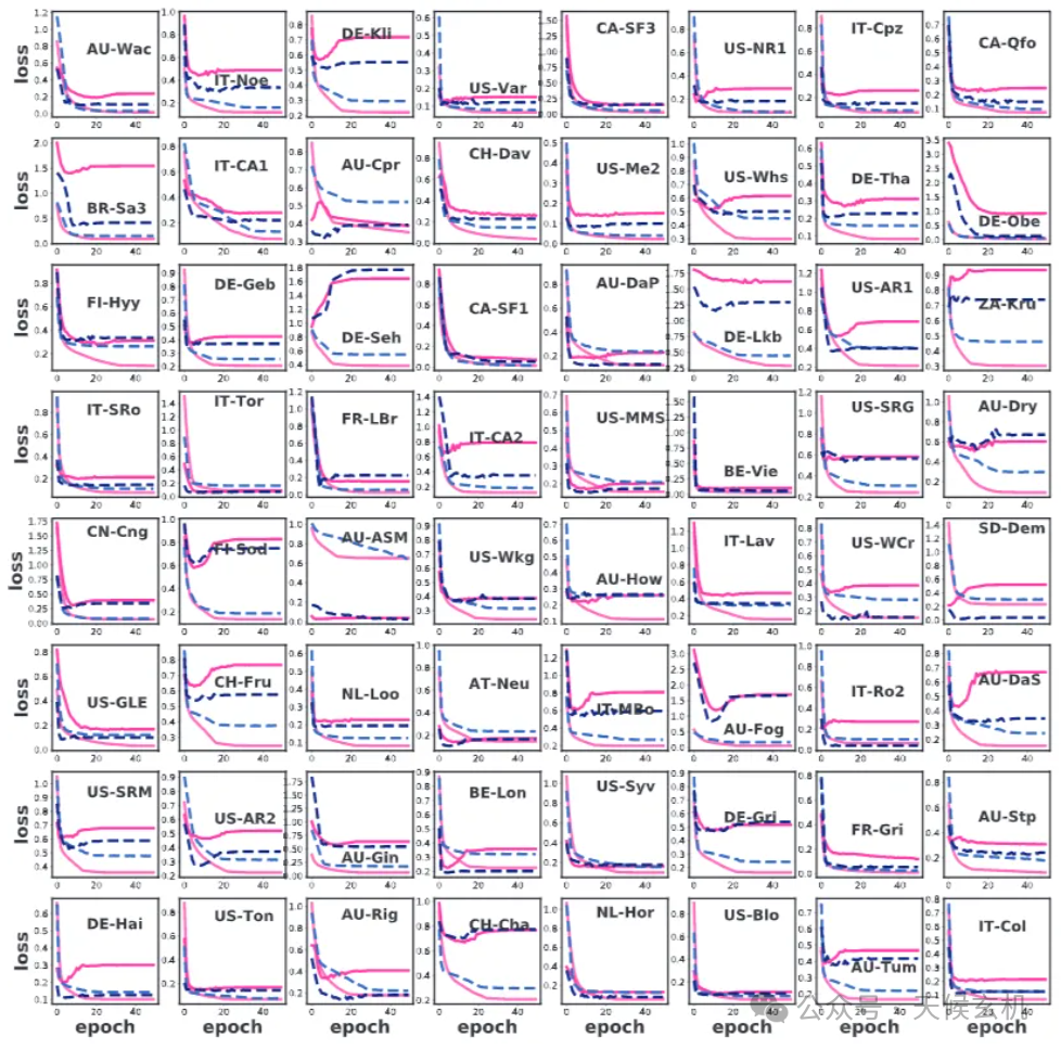 图4 土壤水分记忆(用时间自相关表示,滞后时间设定为7天)与基于(a)NSE和(b)归一化RMSE的模型性能之间的关系图5 各站点7天LSTM(实线)和CLSTM(虚线)训练和测试数据集的损失值。LSTM的训练损失曲线和测试损失曲线分别用浅粉色线和深粉色线表示,CLSTM的训练损失曲线和测试损失曲线分别用浅蓝色线和深蓝色线表示。