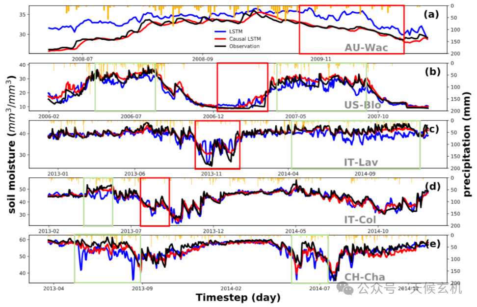 降水事件响应预测:在降水最大的五个站点,CLSTM 在湿润期能更好预测土壤湿度对极端降水的响应,干旱期土壤湿度变化稳定,LSTM 则易受数据集中 “噪声” 影响,出现不合理波动,CLSTM 通过因果结构筛选变量减少噪声影响,更准确预测土壤湿度。