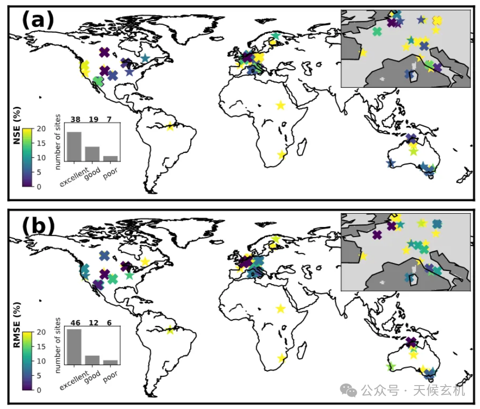数据:使用 FLUXNET2015 的日数据集,经质量控制程序确保数据可靠,包括标记异常数据和观测不足数据为缺失值、排除数据长度不足 3 年及缺失数据超 10% 的站点,最终保留 64 个站点。这些站点全球分布,主要位于北美、欧洲和澳大利亚,涵盖多种植物功能类型,平均时间覆盖约 8 年,数据包括地表土壤湿度观测值及多种用于预测的变量,如气象、能量和地表变量,模型训练前对输入特征数据集进行线性插值和归一化处理。