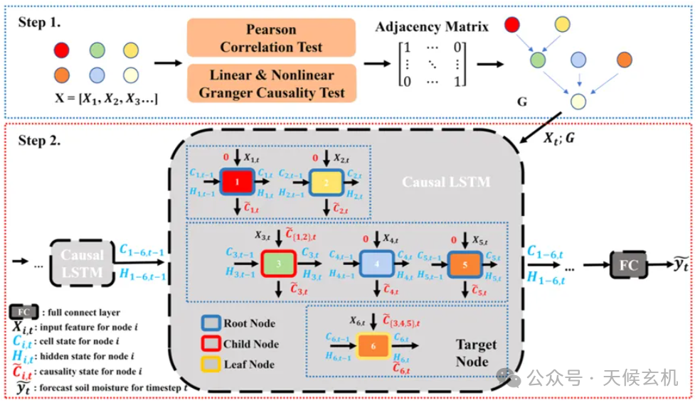 生成因果结构:基于输入特征通过线性和非线性相关及 GC 测试生成因果结构。先生成输入特征的简单邻接矩阵,计算 Pearson 相关系数(PCC),若大于 0.7 且通过显著性检验则变量有显著相关性,再对显著相关变量进行线性和非线性 GC 测试,通过测试则有显著因果关系,据此构建邻接矩阵并转换为因果结构,为避免过拟合将因果结构深度设为三级,若无显著因果关系则设相关性最强变量为土壤湿度因果驱动因素。