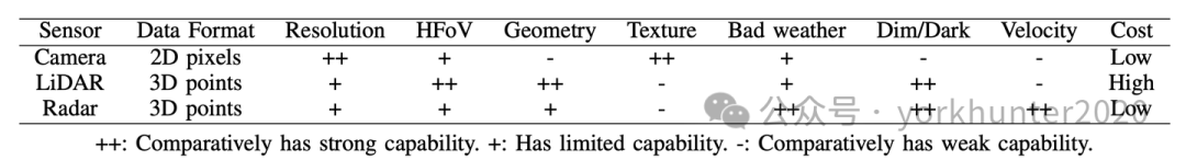 现有四种多模态组合的多模态集成研究成果:1)摄像机和激光雷达,2)摄像机和雷达,3)激光雷达和雷达,4)摄像机、激光雷达和雷达。至于其余的模态组合,研究很少。