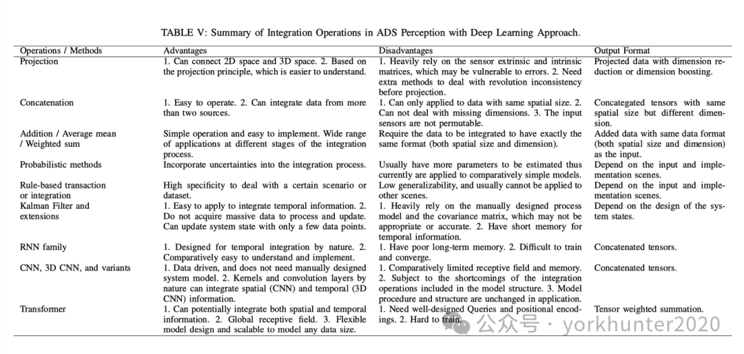 “如何集成”涉及用于组合数据/特征的数学运算。Feng[14]将深度学习网络中使用的融合操作总结为四类:加法/平均均值、连接、集成和专家混合。不同集成操作的特点在研究中没有进一步阐述。Wang[15]将3D目标检测的数据组合方法分为两种主要类型:对齐和融合。对齐进一步细分为基于投影和基于模型的方法,而融合分为基于学习和与学习无关的方法。对齐在许多情况下也作为融合的一种手段,基于模型的对齐和基于学习的融合技术彼此显示出明显的重叠。此外,由于 [14] 和 [15] 都专注于特定感知任务(目标检测和语义分割)的方法,因此未讨论其他集成操作,例如 EKF [154]、[185] 或概率图 [89]、[118]。