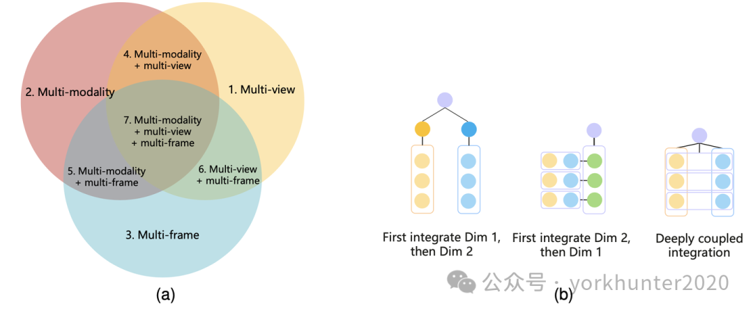 鉴于这三个维度,可以将所有数据集成方法分为七个上层类别,如图 a 所示。数据集成不仅可以在三个维度之一内实现,还可以在多个维度上进行。前者称为单维集成。