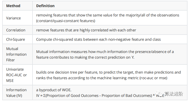我们应该记住,不同的特征子集可以为不同的算法提供最佳性能。因此,它不是机器学习模型训练的一个单独过程。因此,如果我们为线性模型选择特征,最好使用针对这些模型的选择程序,如回归系数或套索的重要性。如果我们为树选择特征,最好使用树导出的重要性。筛选方法根据性能指标选择特征,而不管以后采用哪种机器学习算法。单变量过滤器根据特定标准对单个特征进行评估和排名,而多变量过滤器则对整个特征空间进行评估。过滤器方法有: