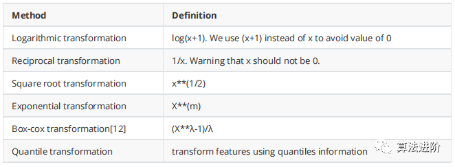 在“小”数据集(少于几百个点)上,分位数转换器很容易过度拟合。建议使用幂变定义:通过现有功能的组合创建新功能。这是向数据集添加领域知识的好方法。如第3.1节所述,我们可以创建一个新的二进制特征,用0/1表示原始特征上的观察值是否有缺失值。通过对原始特征进行简单的统计计算来创建新特征,包括:- 最大值/最小值/标准偏差/方差/范围/四分位数间距/变异系数