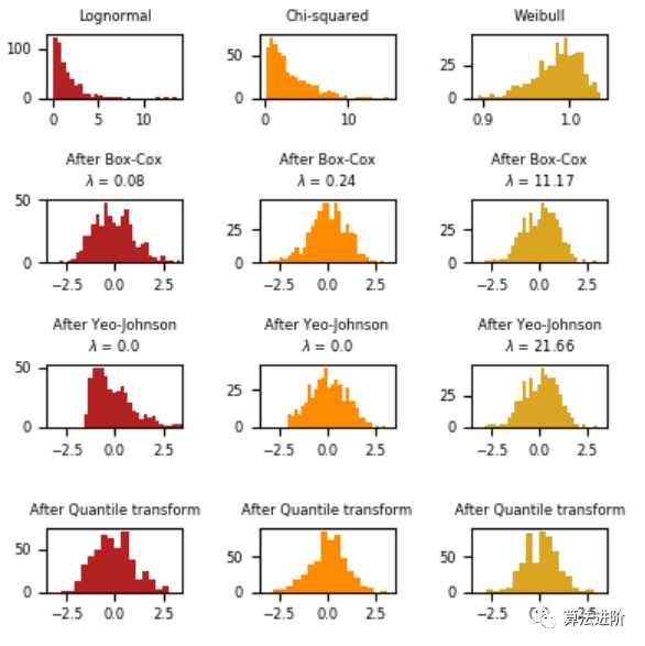对数变换在应用于偏斜分布时非常有用,因为它们往往会扩大落在较低幅度范围内的值,并倾向于压缩或减少落在较高幅度范围内的值,这有助于使偏斜分布尽可能地接近正态分布。sklearn中的Box-Cox变换是另一种属于幂变换函数家族的流行函数。该函数有一个先决条件,即要转换的数值必须是正数(类似于对数变换所期望的)。如果它们是负数,则使用常数值进行移位会有所帮助。从数学上讲,Box-Cox变换函数可以表示如下。sklearn中的分位数变换将特征转换为遵循均匀分布或正态分布。因此,对于给定的特征,这种变换往往会分散最常见的值。它还降低了(边际)异常值的影响:因此,这是一种稳健的预处理方案。然而,这种变换是非线性的。它可能会扭曲以相同尺度测量的变量之间的线性相关性,但会使以不同尺度测量的变量更直接地具有可比性。我们可以用QQ图来检查变量在转换后是否呈正态分布(理论分位数上值的45度直线)。下面是一个例子,展示了sklearn的箱线图/Yeo-johnson/分位数变换的效果,将各种分布的数据映射到正态分布。