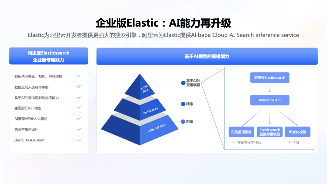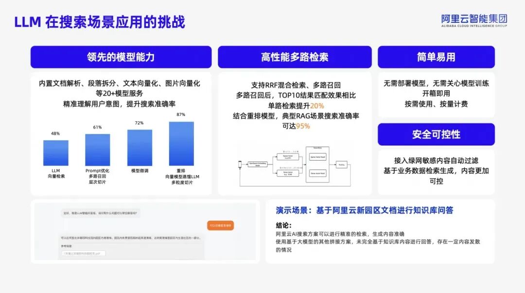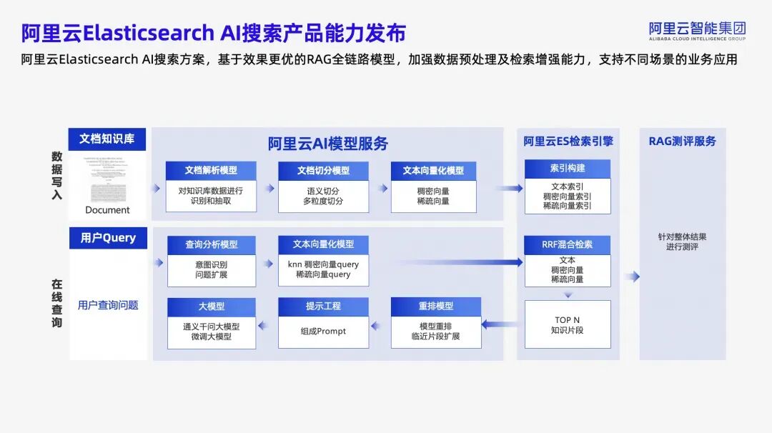 Elasticsearch 利用诸如稀疏编码技术,不仅能够基于原始词汇建立索引,还能有效扩展至与其相关的概念或词汇,每项扩展均附有模型计算出的权重,增强了语义理解的深度和广度。这得益于稀疏向量技术,它以较低内存占用高效存储信息,对比稠密向量需全内存索引,显著提升了资源效率。查询过程受益于倒排索引结构,避免了向量相似度匹配的开销,加速了检索速度。此外,Elasticsearch 的稀疏向量减少了内存需求,进一步优化了资源利用。现代搜索需求促使 Elasticsearch 支持多模态查询,结合文本、向量检索以及rrf混合排序方法,以增强结果的相关性和覆盖范围。这种混合搜索策略能够召回更多样化的数据,提升用户体验。为了从召回的大量数据中精确选出最相关的结果,ES 采用如BM25等排序机制,考虑文档频率和位置等因素初步确定权重。随后,通过集成学习或更精细的模型(如Rerank阶段)对初步筛选出的文档进行二次排序,确保顶部结果高度相关。Elasticsearch 展现了强大的模型集成能力,允许用户直接将自定义模型加载至集群中运行,实现从输入到输出(如词嵌入生成)的端到端处理,无需外部预处理步骤。这不仅简化了工作流程,还促进了机器学习模型与搜索引擎的无缝融合,强化了系统的智能化水平和适应性。阿里云 Elasticsearch 将准确率提升至95%阿里云 Elasticsearch AI 搜索产品依托于强大的 Elasticsearch 基础,基于阿里云 AI 搜索开放平台,整合多样化模型与混合检索技术,实现了从传统搜索到 AI 语义搜索的跨越。该方案通过精细的数据预处理、智能向量化、多维度检索召回、以及大模型辅助生成,形成了一个完整且高效的 RAG 场景应用框架。- 文档解析与切分:利用自研模型识别非结构化数据,提取关键信息,保证内容的完整性和语义连贯性。