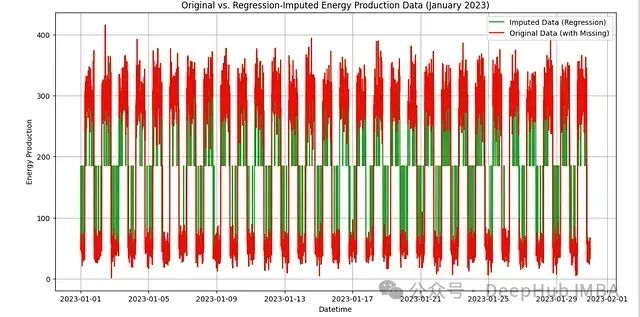 # 第六步:结果可视化(展示2023年1月数据) start_month = datetime(2023, 1, 1) end_month = datetime(2023, 1, 31) original_month_data = mock_energy_data_with_missing[ (mock_energy_data_with_missing['Datetime'] >= start_month) & (mock_energy_data_with_missing['Datetime'] <= end_month) ] imputed_month_data = filled_data[ (filled_data['Datetime'] >= start_month) & (filled_data['Datetime'] <= end_month) ]