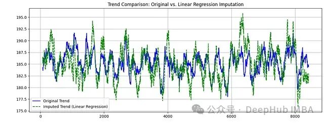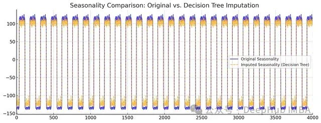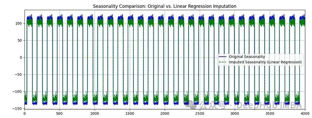 图4:趋势组件比较。蓝线表示原始数据趋势,绿虚线表示补充数据趋势。图5:季节性组件比较。展示了原始数据和补充数据的周期性模式。- 趋势线的平滑程度增加,这是线性回归方法的特性导致的