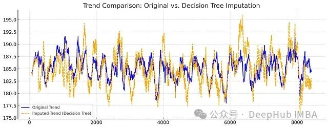 图6:决策树补充结果可视化。橙线表示决策树补充的数据,红线表示原始数据。从图中可以直观地看到,决策树方法在保持数据特征方面展现出了以下优势: