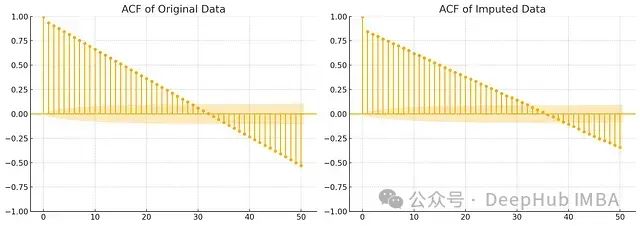 图3:自相关函数对比分析。左图显示原始数据的自相关性,右图显示补充后数据的自相关性-