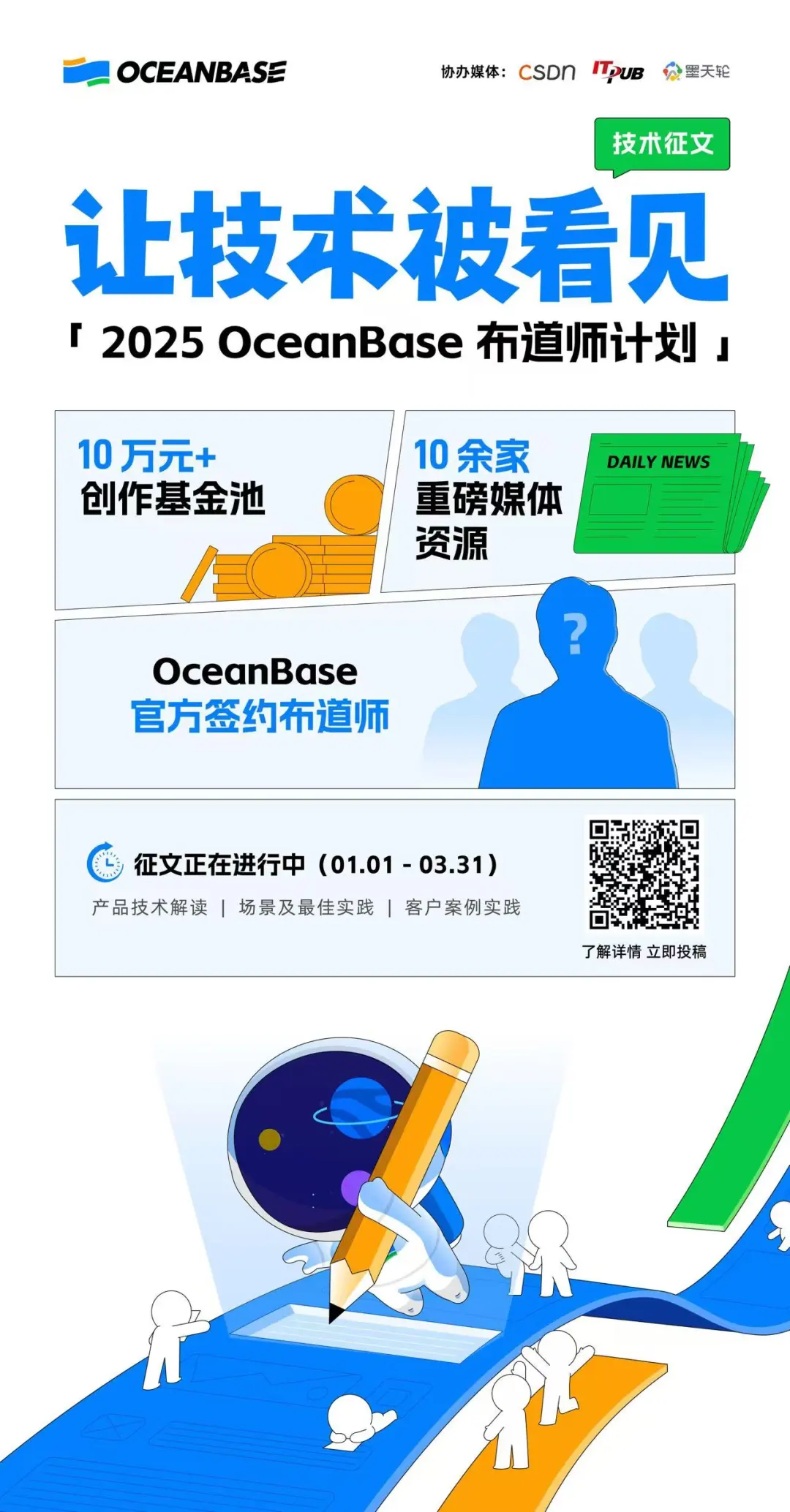 活动仍在进行中,欢迎感兴趣的小伙伴点击「阅读原文」进入活动官网,了解活动详情或进一步投稿:https://open.oceanbase.com/blog/essay-competition。