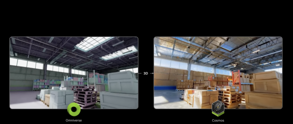 简单来说,Cosmos是一种类似“预测未来”的工具。它能把真实世界的规则整理好,根据当前的情况猜测接下来会发生什么,然后告诉自动驾驶汽车或机器人该怎么做。比如,假设前面有障碍物,模型会预测它可能移动的方向,并指导汽车或机器人做出反应。这套工具是目前第一款专门为训练AI、自动驾驶和机器人的世界模型。此外,黄仁勋在会场还演示了将Cosmos与英伟达Omniverse平台联合使用的功效,开发者可以基于Omniverse创建虚拟的三维场景,再叠加使用Cosmos生成与真实世界高度相似的场景,以便于开发者用于模型训练。(左侧:Omniverse制作的虚拟仿真世界 右侧:叠加Cosmos生成的效果)在这个过程中,Cosmos对于机器人数据瓶颈最大的帮助,是用最低的成本,来缩小虚拟数据与物理世界数据的误差。但Cosmos生成的合成数据未必能完全代替真实数据的作用。合成数据与真实数据各有优势,它们是一种互补关系,这一点从黄仁勋和马斯克近期的观点中也可以看出。根据TechCrunch报道,马斯克在2024年12月也发表了对于AI数据的看法,他赞同人工智能行业已经达到“数据峰值”的说法,“补充现实世界数据的唯一方法是使用合成数据”。有趣的是,黄仁勋在2025年CES后的采访中表示,Cosmos生成的合成数据无法替代真实数据,并认为自动驾驶应该尽可能使用真实数据,并且赞赏马斯克的特斯拉汽车工厂拥有大量行驶数据。他们一个拥有高配置的仿真数据生成平台,一个拥有丰富的自动驾驶数据资源,在坚守各自阵地的同时,却也都在欣赏着对方的领域。参考资料:NVIDIA Launches Cosmos World Foundation Model Platform to Accelerate Physical AI Development | NVIDIA Newsroom (如需交流欢迎加作者微信:aiyukuailetongzai ,烦请备注公司+职务)