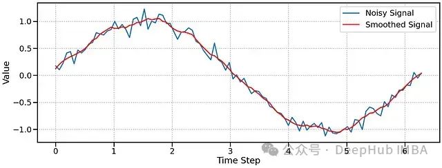 plt.plot(x, y, label='Noisy Signal') # 原始含噪信号 plt.plot(x, y_smooth, label='Smoothed Signal', color='red') # 滤波后信号 plt.grid(lw=2,ls=':') plt.xlabel('Time Step') # 时间步长 plt.ylabel("Value") # 信号值 plt.legend() plt.show()