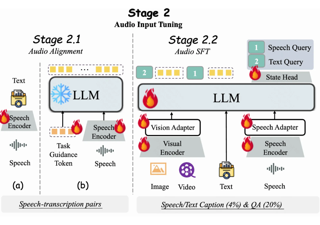 完成阶段 1 的训练后,模型在图像和视频理解方面已打下坚实基础。本阶段目标是在阶段 1 的基础上减少语音和语言之间的差异,使 LLM 能够理解音频输入。训练数据包括 11,000 小时的语音-转录对。采用两步法:(a)语音编码器训练:使用 CTC 损失函数训练语音编码器,目标是让编码器从语音输入中预测转录文本。确保音频编码器能够提取语音特征并将其映射到文本表示空间。(b)语音适配器训练:训练语音编码器后,将其与 LLM 集成,使用音频适配器将音频特征引入 LLM 的输入层。本阶段的训练目标是使 LLM 输出语音数据的转录文本。此外,在步骤(b)中引入特殊的可训练输入 token,以引导语音理解过程,这些 token 提供额外的上下文信息,引导 LLM 执行 ASR 任务。