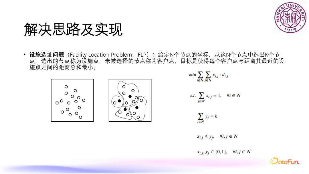 基于质心的非常经典的问题是设施选址问题,给定 n 个节点的坐标,需要从这 n 个节点中选出 k 个,这 k 个节点称为设施点,会在这些节点上安排一些设施(比如超市),其他没有被选中的节点称为客户点,客户点会选择一个距离最近的设施点为其提供服务。目标就是要使得每个客户点与之距离最近的设施点之间的距离之和最小,这里给出了相应的数学规划形式。