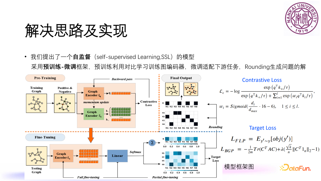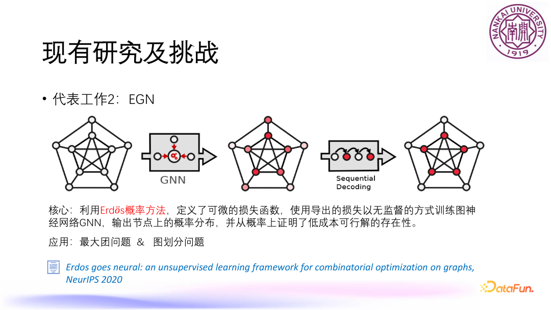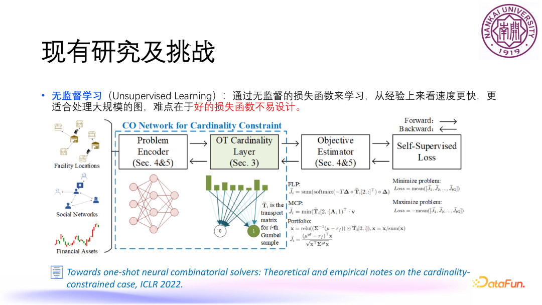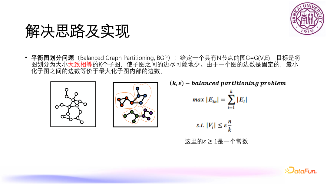 非基于质心的图聚类优化问题,例如平衡图划分问题 BGP,即给定 n 个节点,想把这个 n 个节点分成 k 个簇,希望这 k 个簇所含的点数尽可能相等,还有另外一个目标是要使得这 k 个簇之间的边尽可能的少,就是不同部分之间的边尽可能的少。由于一个图的总边数是固定的,想要最小化子图之间的边数,就等价于使得子图内部的边数最大化,所以就转化成了使得内部边数最大化的问题,上图中给出了相应的数学规划形式。
