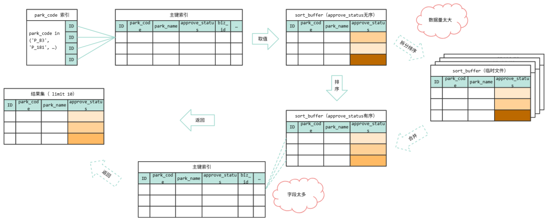 2)回表查询各个字段,由于字段太多,丢弃一些,把需要排序的字段放到 sort_buffer