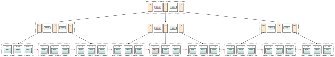 对于B树,如果是等值查询,效率是很高的;但是对于范围查找,效率有所下降,因为要找到左右两个区间值,并且要遍历中间的所有子树。为了解决这个问题,B+树登场了。