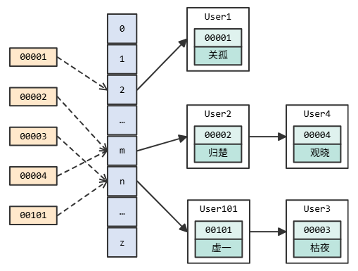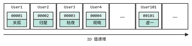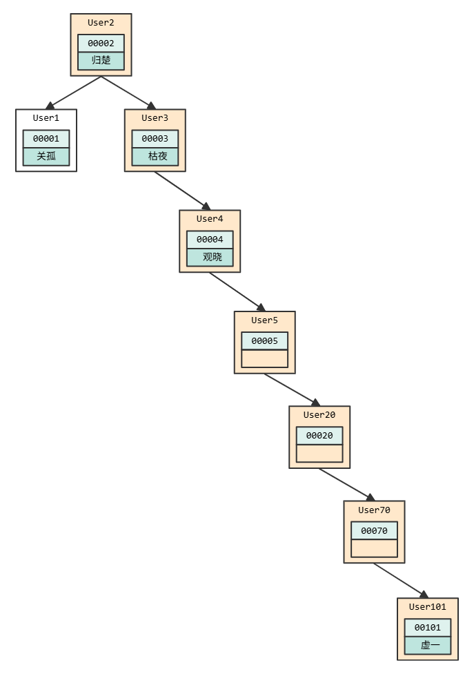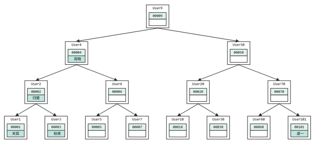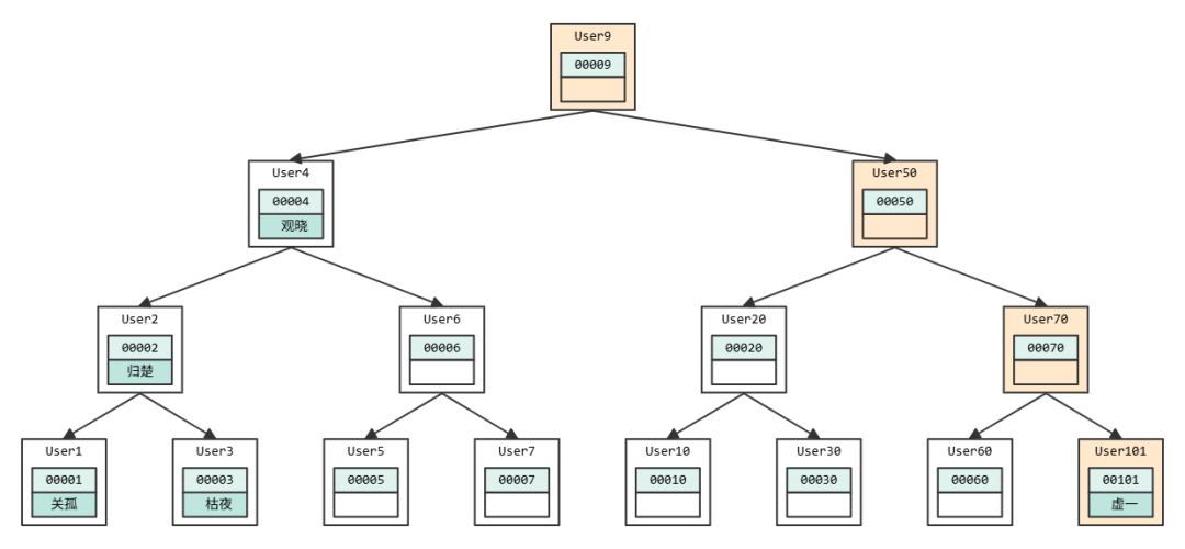 如果要查 User101 这个用户的话,按照图中的顺序就是 User9 → User50 → User70 → User101这个路径得到。时间复杂度是 O(log(N))。