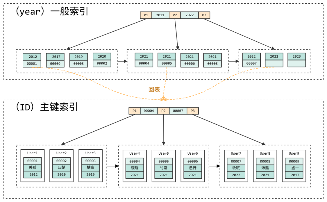 这两条查询语句在性能上有什么不同?我们通过上图可以知道,基于主键查询,只需要检索 ID 这棵 B+树,就可以直接得到结果数据;而普通索引查询,需要先搜索 year 这棵 B+树,得到 ID 的值为 00001,再到 ID 索引树搜索一次,这个过程也被称为回表。也就是说,基于非主键索引的查询需要多扫描一次索引树。所以,我们在应用中应该尽量使用主键查询。