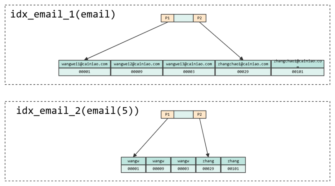 select id, email from table where email = 'wangwei3@cainiao.com',分别使用index_email_1(email) 和 idx_email_3(email(8)) 会有什么差别?