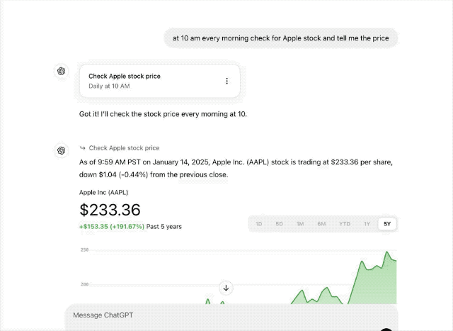 无论是一次性提醒还是重复性任务,现在你只需要向 ChatGPT 说明需求和时间,它就能实现自动化处理。比方说,你可以设置每天早晨 7 点获取天气预报,或定时提醒遛狗等日常事项。