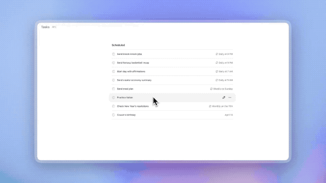 所有任务均可在对话界面或网页版个人档案的 Tasks 专区进行管理,随时轻松修改或取消已设置的任务。