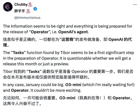 除了一片吐槽声,也有不少用户推测 Tasks 可能是 OpenAI Operator 的雏形。X 用户 @kimmonismus 就认为:「信息似乎是正确的,一切都在为『Operator』的发布做准备。」