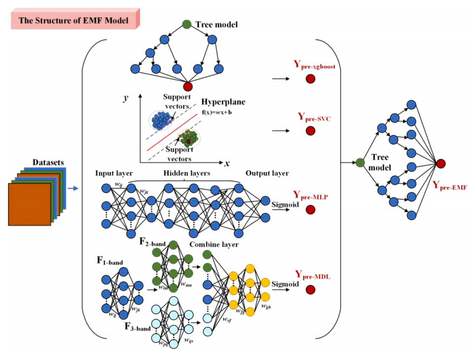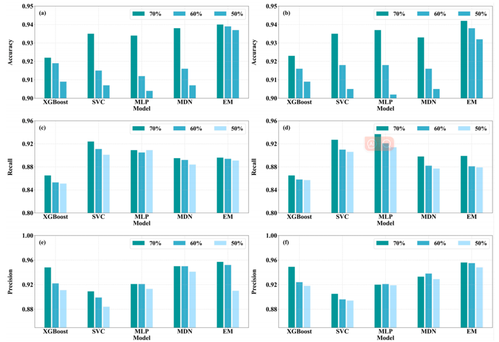 模型评估指标性能:EMF 模型在训练集和测试集上准确率分别为0.942和0.940,在五种模型(EMF、MDL、XGBoost、SVC、MLP)中准确率、精度和F1分数最高,召回率和MR *值适中。