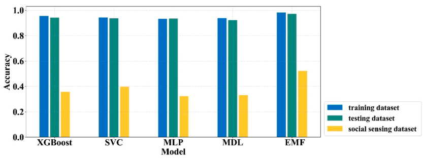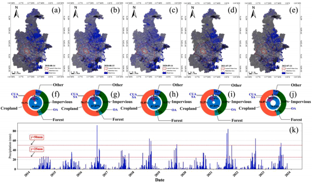 不同ML模型映射性能:在农田、山区和城市地区,各模型提取的洪水区域有差异。农田中一致性较高,但单一模型在小村庄和道路区域易低估;山区因阴影和地形复杂,单一模型低估山谷洪水;城市中由于水和路面反射及建筑物影响,单一模型低估更严重,EMF模型表现更优。