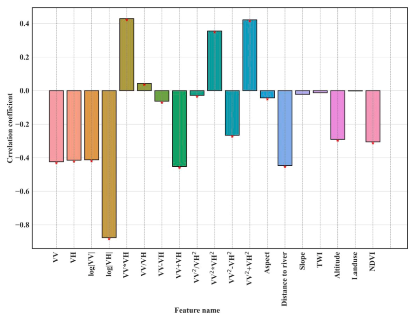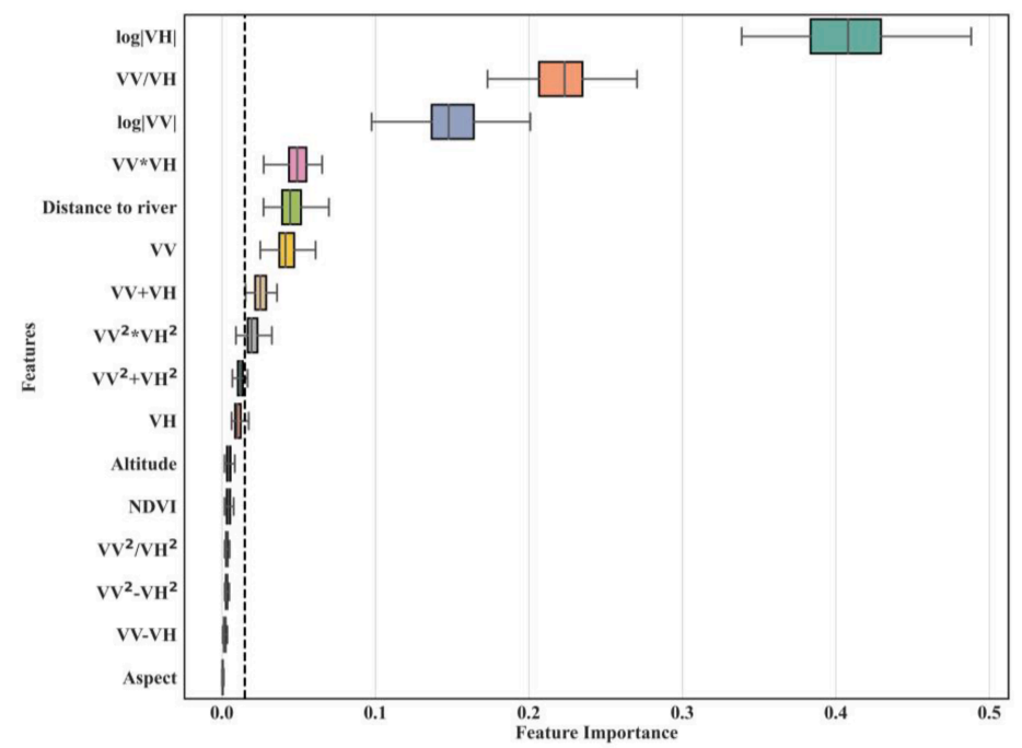 模型特征选择:分析输入特征与洪水发生的相关性,确定VVVH、VV²VH²等极化波段和到河流距离等为关键特征,经FFIR方法筛选后作为最终输入变量。