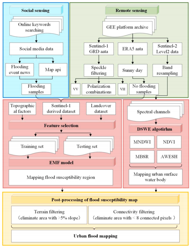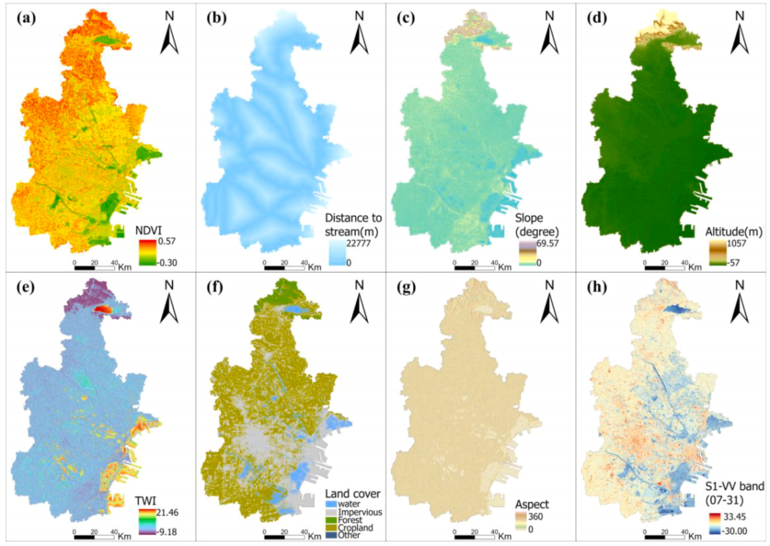 洪水区域映射:EMF模型估计的洪水面积最大,为1265.14 km²,洪水主要位于天津中东部和南部,西部较小且分散,北部山区洪水集中在山脊和山谷。