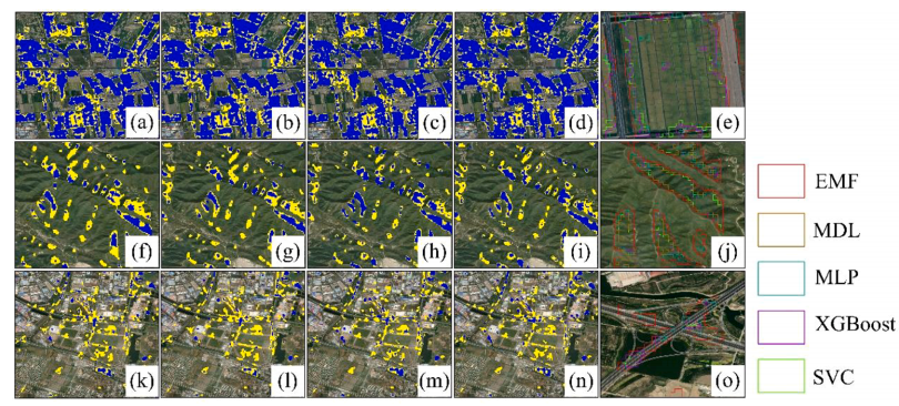 图9 四种独立ML模型与EMF模型在农田[(a) - (e)]、山区[(f) - (j)]和城市地区[(k) - (o)]的洪水面积提取比较。蓝色表示独立模型提取的洪涝面积。黄色表示EMF模型确定的其他受洪水影响的地区。(a)、(f)和(k)比较了XGBoost和EMF模型提取的洪水面积。同样,(b)、(g)和(l)比较了SVC和EMF模型;(c)、(h)和(m)比较MLP和EMF模型;(d)、(i)和(n)比较MDL和EMF模型。(e)、(j)和(o)分别描绘了不同模型在局部放大的农田、山区和城市地区提取的洪水边界。红色、棕色、蓝色、紫色和绿色分别代表EMF、MDL、MLP、XGBoost和SVC提取的洪水范围