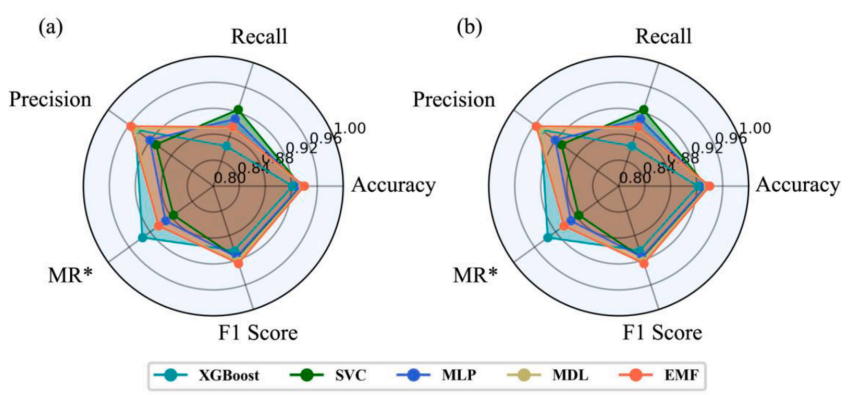 图8 使用XGBoost、SVC、MLP、MDL和EMF模型对训练数据集(a)和测试数据集(b)进行性能评估。为了方便在统一尺度上对不同模型的分类精度进行视觉比较评估,通过添加0.8来调整所有模型的缺失率值。调整后的度量在图中用MR*表示