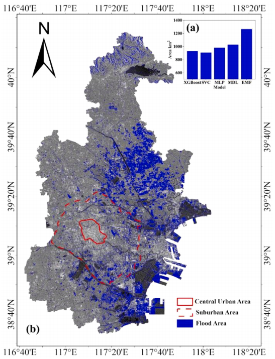 图10 (a) 2023年7月31日天津市XGBoost、SVC、MLP、MDL和EMF模型提取的总洪水面积对比。(b)利用EMF模型分析天津洪涝面积的空间分布。红色实线代表中心城区,虚线代表郊区。灰色底图对应于使用VV偏振波段的Sentinel-1 SAR数据