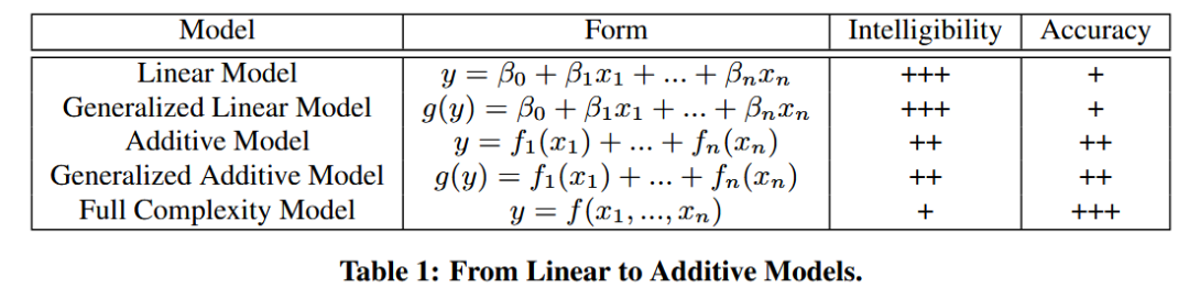 线性模型和广义线性模型是最容易理解的,但通常也是最不准确的。相加模型和广义相加模型在许多数据集上比 GLMs 更准确,因为它们捕获了(单个)特征与响应之间的非线性关系,但保留了线性模型的大部分可理解性。复杂模型在许多数据集上更准确,因为它们同时考虑到了非线性和交互作用,但由于它们过于复杂,导致几乎不可能解释它们。