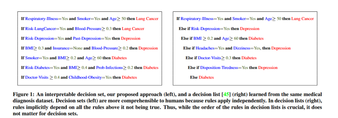 看下面这张图,左侧为可解释决策集,而右侧是规则列表。不难发现,左侧为并列的结构,而右侧为层次嵌套式结构。