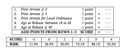 图中列出了几条用于评估囚犯出狱后二次犯罪风险的规则,例如“之前被捕次数≥2,则加1分”“之前被捕次数≥5,则加1分”等,根据这些规则加减分来计算总分。同时,图片给出了不同分数对应的再犯风险概率,例如分数为 - 1 时,再犯风险为 11.9%;分数为 4 时,再犯风险为 95.3%。