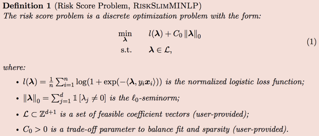 然而,许多风险评分方法仍然是由领域专家手动构建的,这些方法通常依赖于专家判断,缺乏性能保证。Berk Ustun提出通过数据驱动的方式来学习构建风险评分。他把风险评分问题抽象成一个MINLP问题。