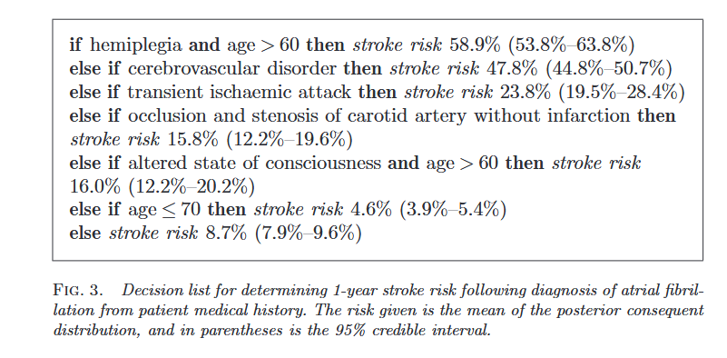 贝叶斯规则列表通常包括三个步骤:预挖掘先行词、构建规则列表、和模型参数推断。以医疗诊断为例,现在收集了年龄、有无高血压病史、是否抽烟等特征,需要通过这些特征去诊断患者患有中风的概率。