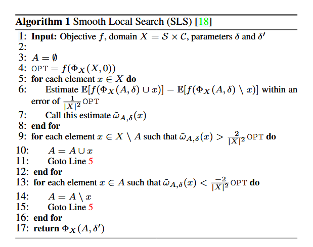 目标函数中包含很多属性,优化它并非容易,这是一个NP问题,目标函数是非负、非常态、非单调的子模函数,用于优化目标函数的一个常用的算法是smooth local search(SLS),该算法通过对基于某个潜在子集