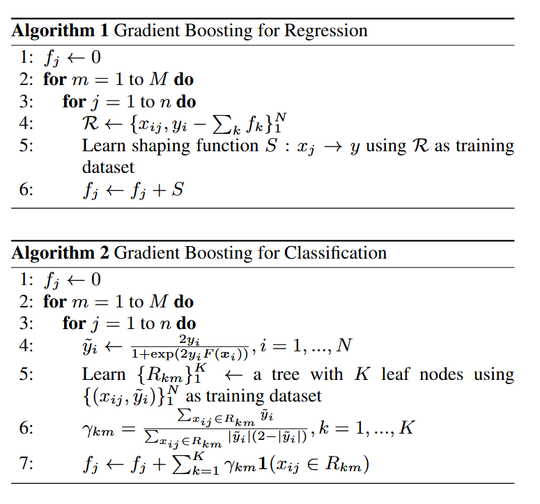 使用标准梯度提升法,唯一的区别是:由于需要学习全部特征的形状函数,在提升的每次迭代中,必须依次循环遍历所有特征。算法伪代码如下: