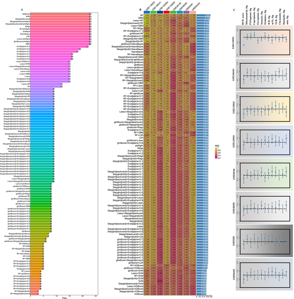 基于23个重叠基因,通过10种机器学习算法的113组组合,共筛选出12个特征基因。ROC分析显示随机森林模型AUC值最高,优于其他12个模型。免疫浸润分析表明高RCD.score组免疫活性更强,免疫细胞浸润更显著。