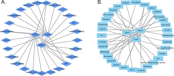 5. 基于3个关键基因构建“TF-miRNA-基因”网络,通过 DrugBank 和 ChEMBL 数据库确定了针对3个基因的候选药物,并构建生物标志物-药物相互作用网络
